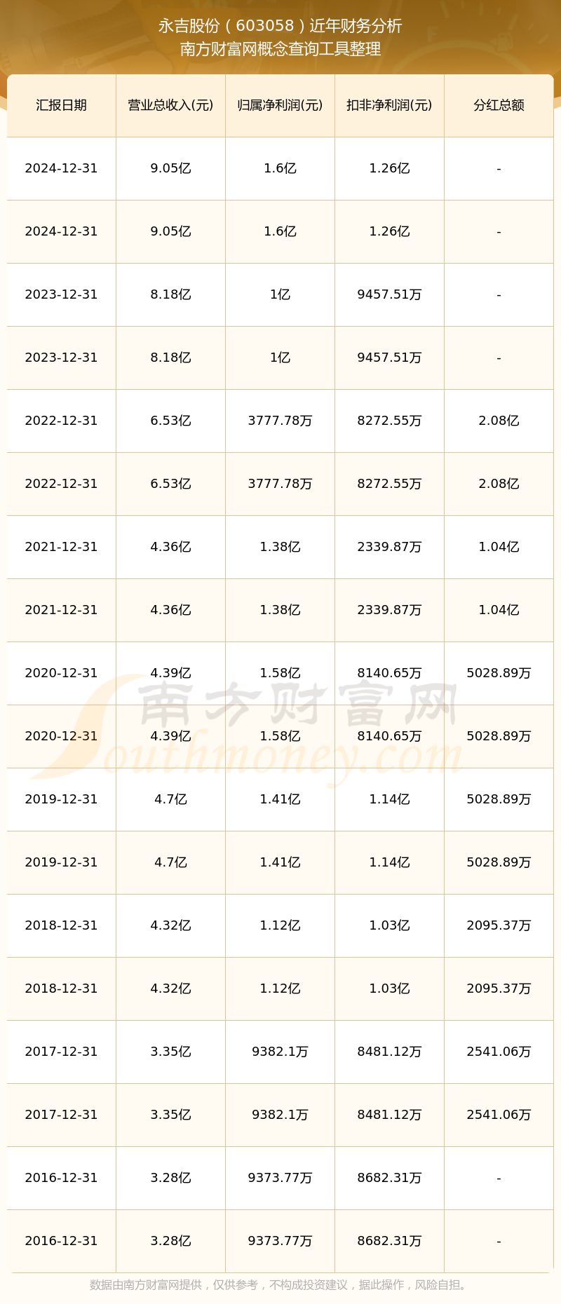 2024年報(bào)顯示,永吉股份實(shí)現(xiàn)營(yíng)收9.05億,同比增長(zhǎng)10.69%;凈利潤(rùn)1.6億,同比增長(zhǎng)59.77%;毛利率40.17%。