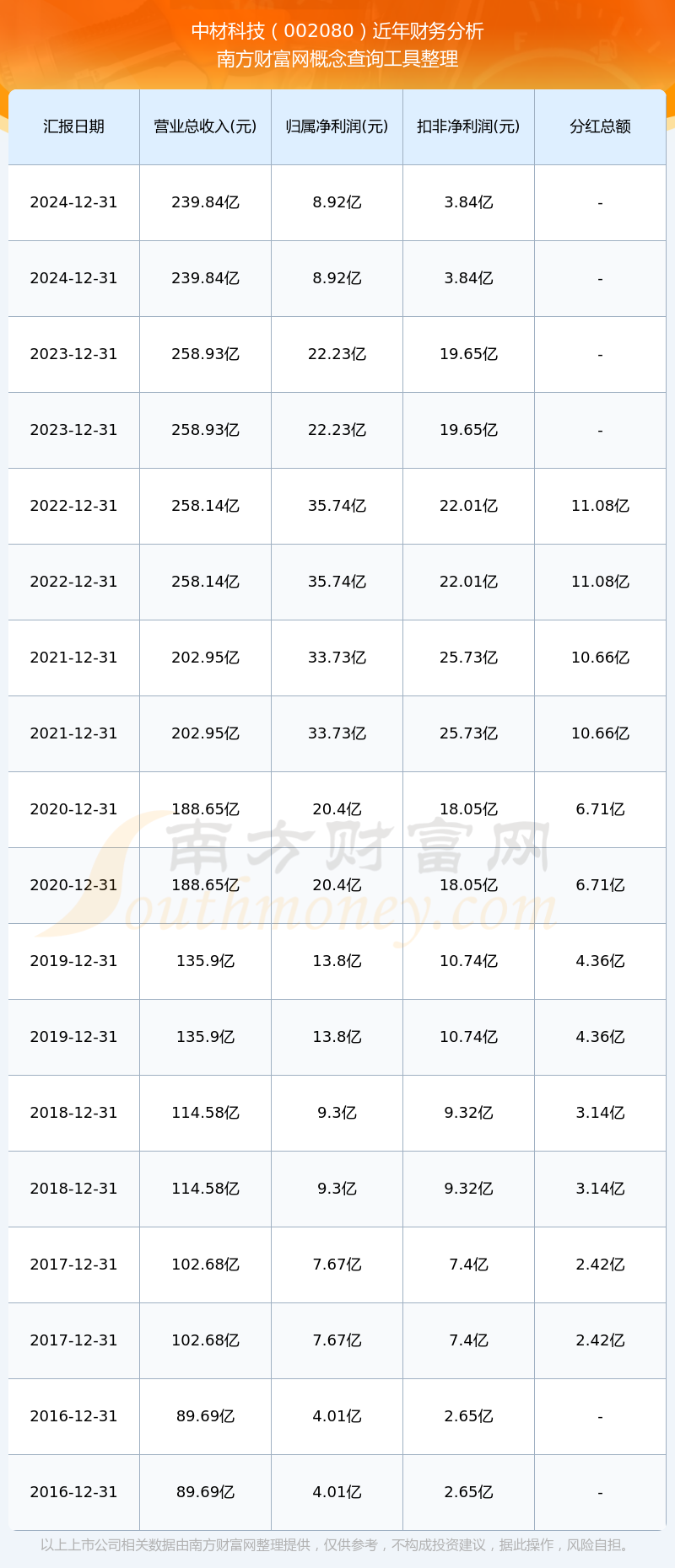 中材科技歷年分紅派息情況如下表所示: