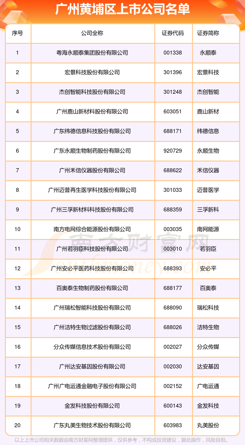 從數(shù)量來看,截至11月26日,廣州黃埔區(qū)共有50家A股上市公司。其中,上交所15家(南方航空、金發(fā)科技、宏昌電子、鹿山新材、原尚股份、好萊客、丸美生物、方邦股份、潔特生物、瑞松科技等),深交所34家(穗恒運(yùn)A、廣發(fā)證券、永順泰、分眾傳媒、達(dá)安基因、廣電運(yùn)通、智光電氣、達(dá)意隆、毅昌科技、海格通信等),北交所1家(永順生物)。