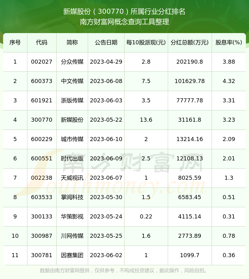 按照南方財富網(wǎng)趨勢選股系統(tǒng)統(tǒng)計,新媒股份所屬行業(yè)為IPTV行業(yè),IPTV行業(yè)分紅排名情況如下表: