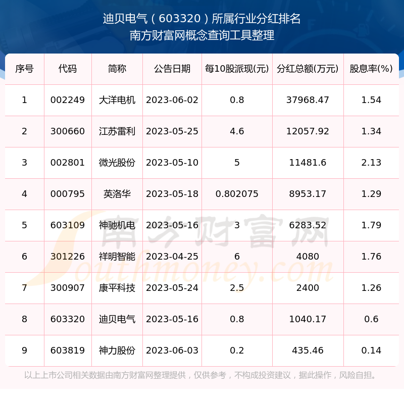 按照南方財富網(wǎng)趨勢選股系統(tǒng)統(tǒng)計,迪貝電氣所屬行業(yè)為電機行業(yè),電機行業(yè)分紅排名情況如下表: