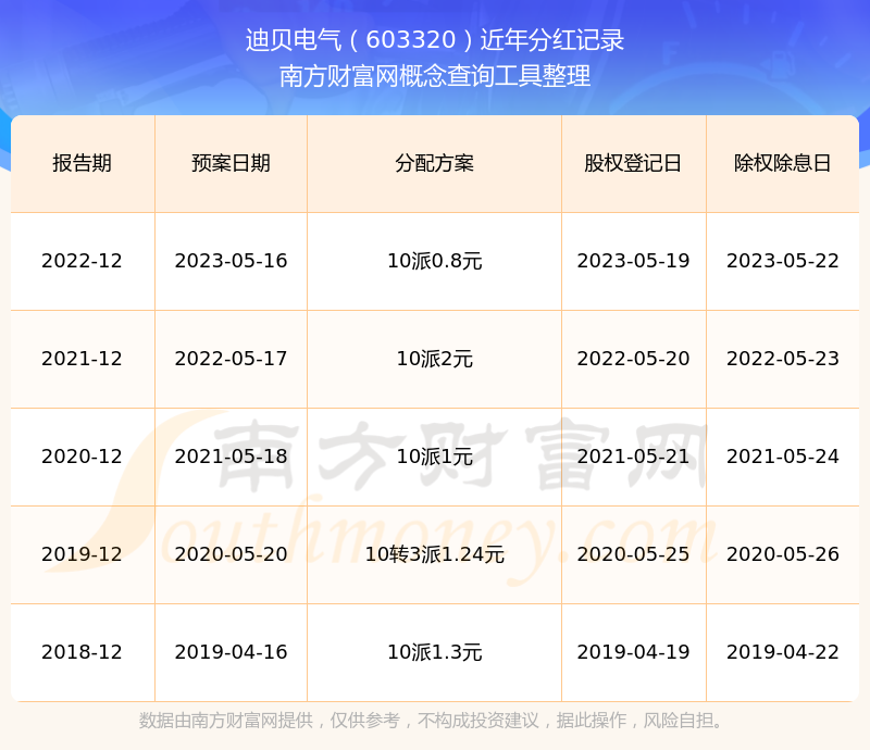 迪貝電氣最新一次公布的分紅方案:10派0.8元。