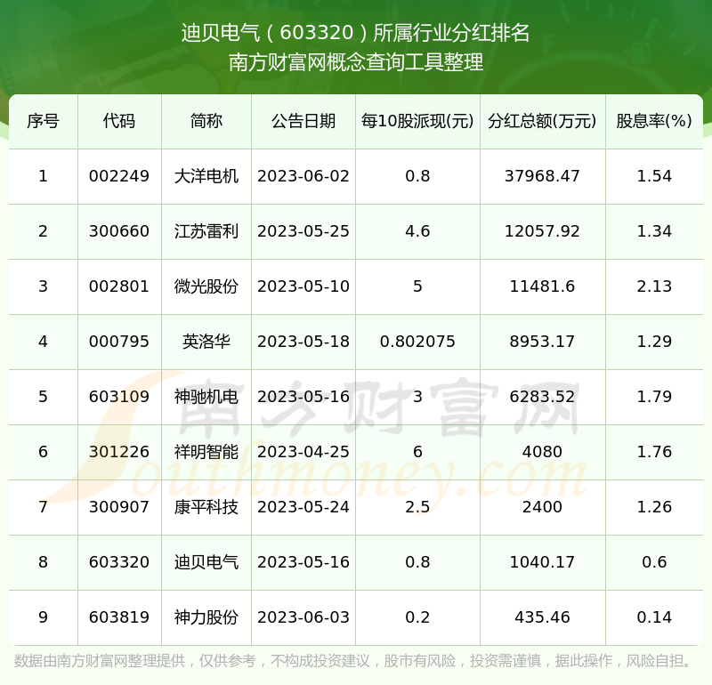 按照南方財(cái)富網(wǎng)趨勢(shì)選股系統(tǒng)統(tǒng)計(jì),迪貝電氣所屬行業(yè)為電機(jī)行業(yè),電機(jī)行業(yè)分紅排名情況如下表: