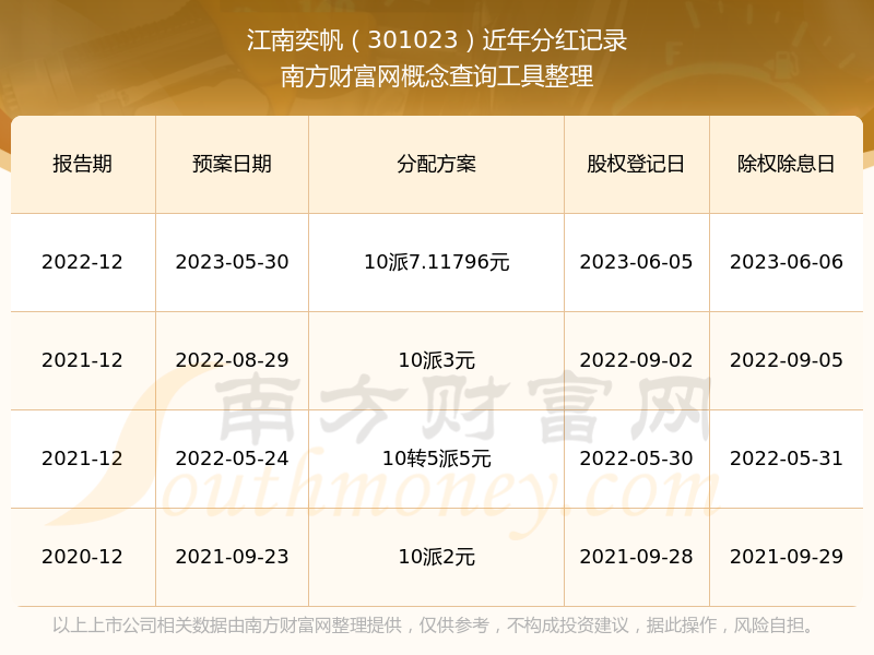 江南奕帆最新一次公布的分紅方案為10派7.11796元。本次權(quán)益分派股權(quán)登記日為2023年6月5日,除權(quán)除息日為2023年6月6日,派息日為2023年6月6日。