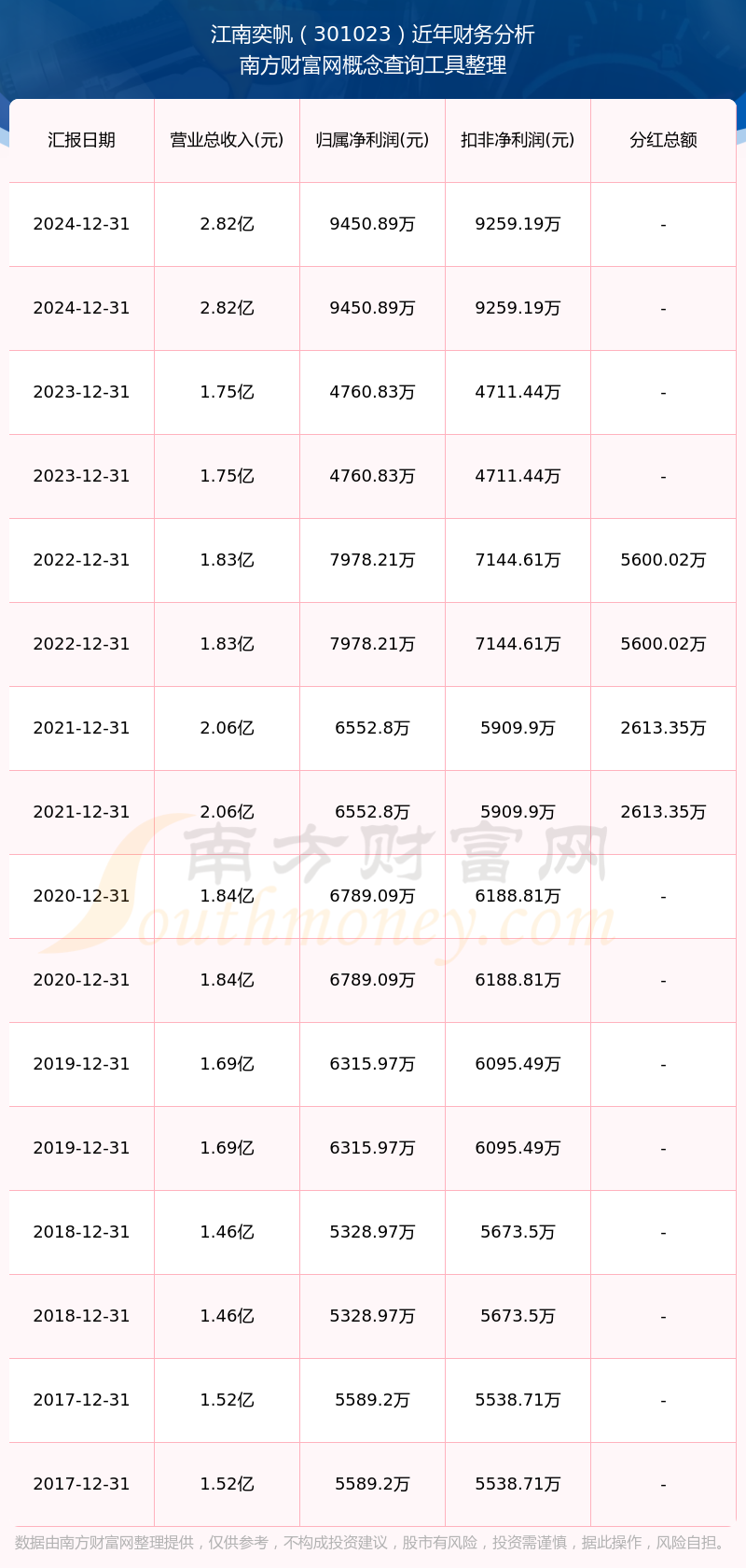 江南奕帆2024年總營(yíng)收2.82億,同比增長(zhǎng)61.69%;凈利潤(rùn)9450.89萬(wàn),同比增長(zhǎng)98.51%;銷售毛利率44.54%。