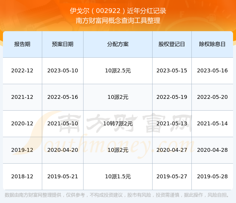 伊戈爾最新一次公布的分紅方案為10派2.5元。本次權益分派股權登記日為2023年5月15日,除權除息日為2023年5月16日,派息日為2023年5月16日。