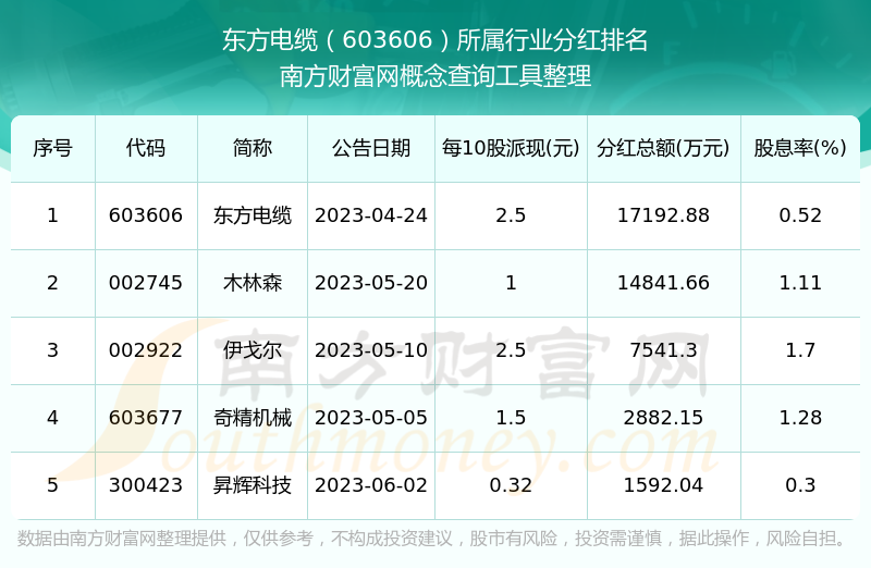 按照南方財富網(wǎng)趨勢選股系統(tǒng)統(tǒng)計,東方電纜所屬行業(yè)為電氣機械行業(yè),電氣機械行業(yè)分紅排名情況如下表: