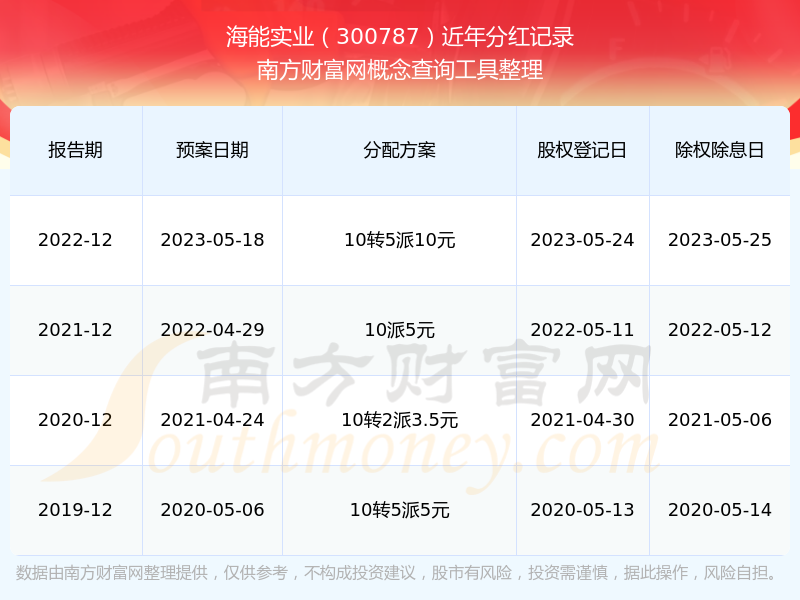 海能實(shí)業(yè)歷年分紅派息情況如下表所示: