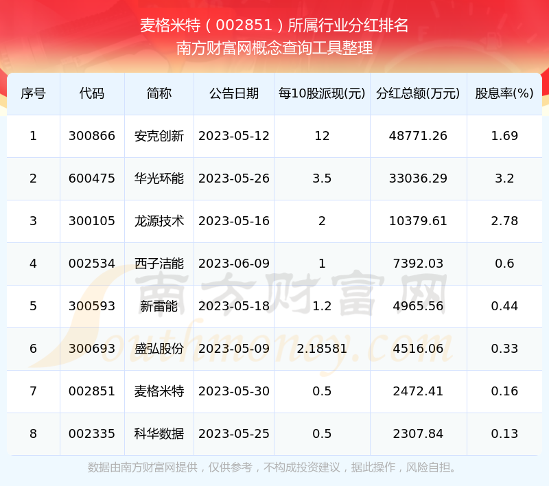 麥格米特最新一次公布的分紅方案:10派0.5元。