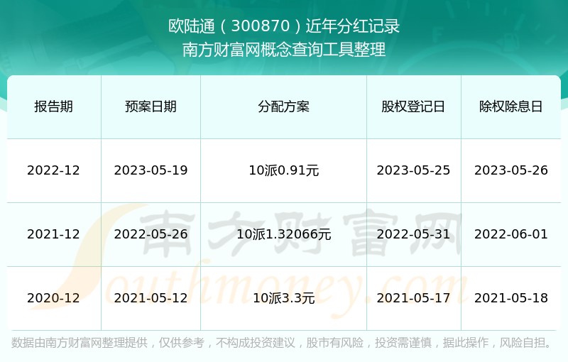歐陸通最新一次公布的分紅方案為10派0.91元。本次權(quán)益分派股權(quán)登記日為2023年5月25日,除權(quán)除息日為2023年5月26日,派息日為2023年5月26日。