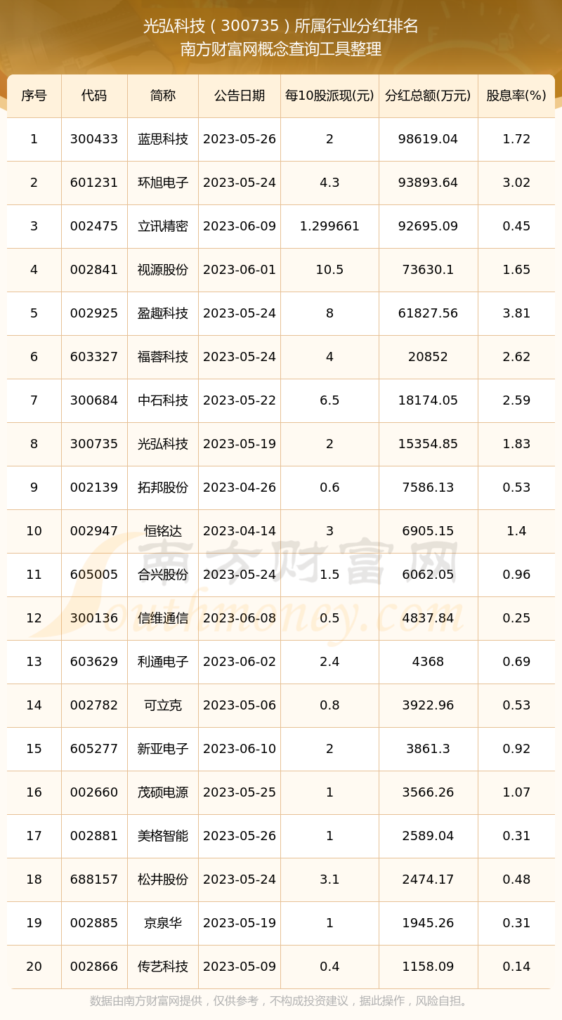 按照南方財(cái)富網(wǎng)趨勢(shì)選股系統(tǒng)統(tǒng)計(jì),光弘科技所屬行業(yè)為消費(fèi)電子行業(yè),消費(fèi)電子行業(yè)分紅排名情況如下表: