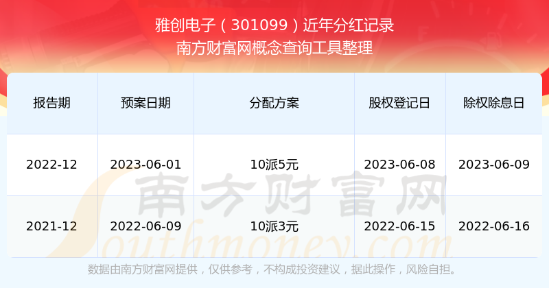 雅創(chuàng)電子最新一次公布的分紅方案為10派5元。本次權(quán)益分派股權(quán)登記日為2023年6月8日,除權(quán)除息日為2023年6月9日,派息日為2023年6月9日。