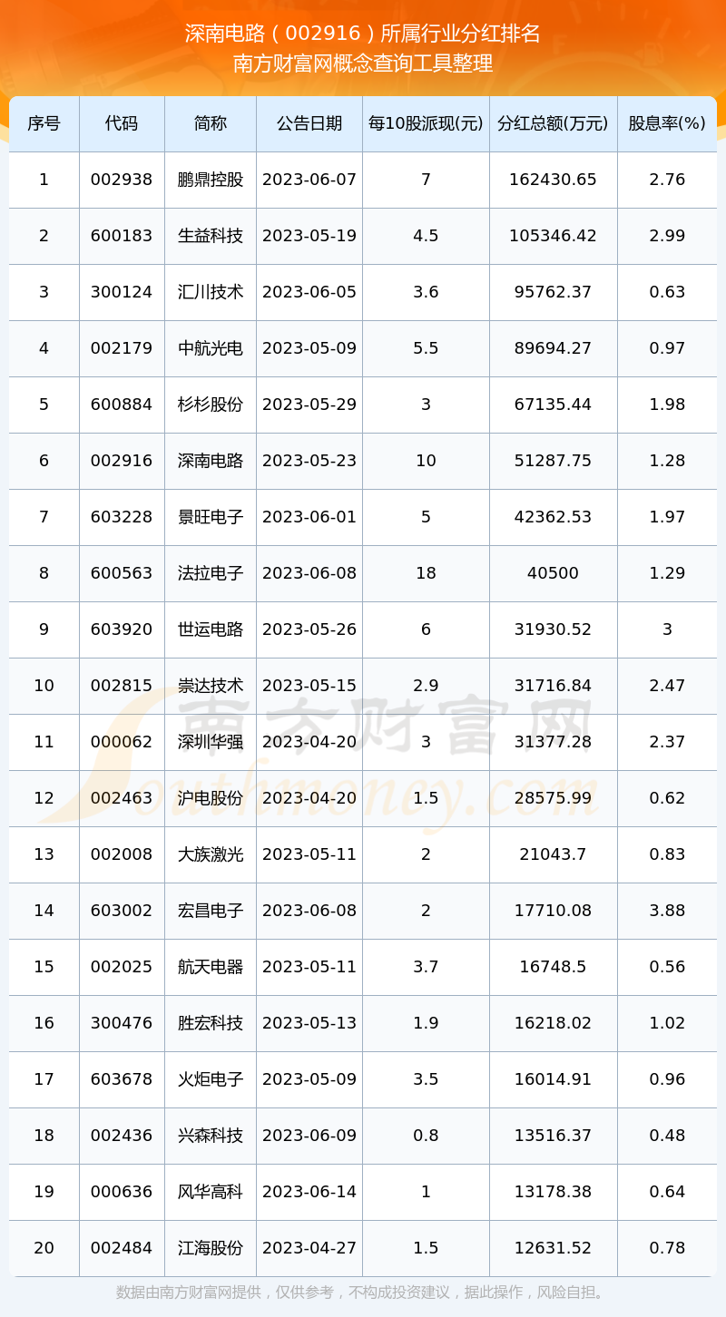 按照南方財(cái)富網(wǎng)趨勢(shì)選股系統(tǒng)統(tǒng)計(jì),深南電路所屬行業(yè)為印制電路板行業(yè),印制電路板行業(yè)分紅排名情況如下表: