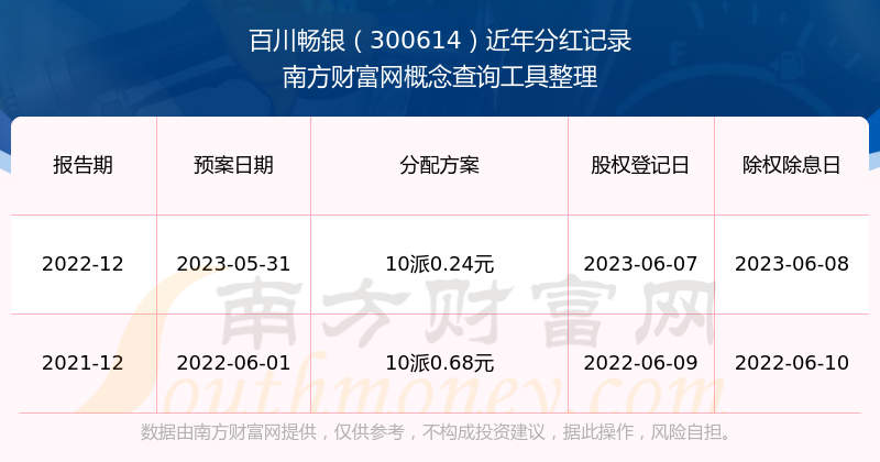 百川暢銀最新一次公布的分紅方案為10派0.24元。本次權(quán)益分派股權(quán)登記日為2023年6月7日,除權(quán)除息日為2023年6月8日,派息日為2023年6月8日。