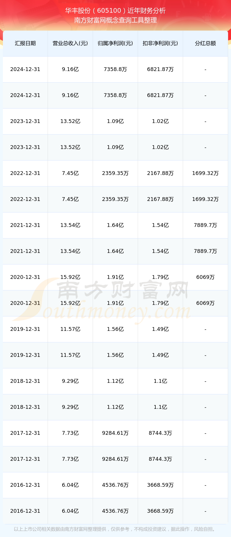 2024年華豐股份總營收9.16億,同比增長-32.23%;凈利潤7358.8萬,同比增長-32.67%;銷售毛利率15.88%。