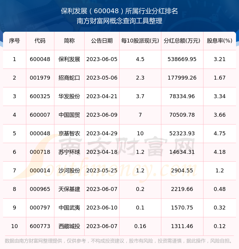 按照南方財(cái)富網(wǎng)趨勢(shì)選股系統(tǒng)統(tǒng)計(jì),保利發(fā)展所屬行業(yè)為房地產(chǎn)開(kāi)發(fā)行業(yè),房地產(chǎn)開(kāi)發(fā)行業(yè)分紅排名情況如下表:
