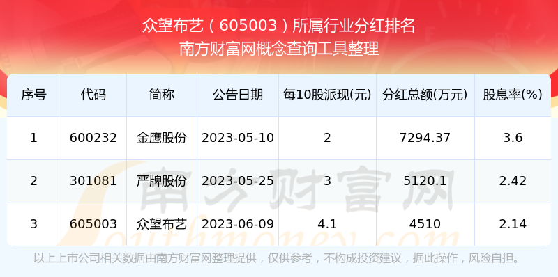 眾望布藝最新一次公布的分紅方案為10派4.1元。本次權(quán)益分派股權(quán)登記日為2023年6月15日,除權(quán)除息日為2023年6月16日,派息日為2023年6月16日。