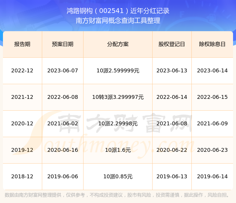 鴻路鋼構(gòu)最新一次公布的分紅方案:10派2.599999元。