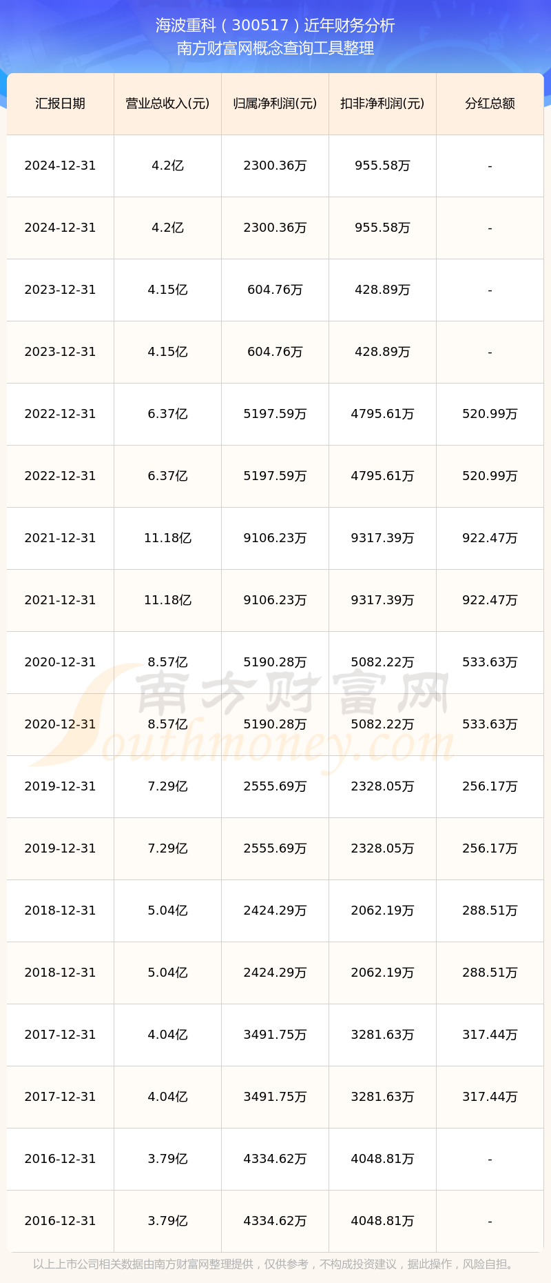 海波重科2024年總營(yíng)收4.2億,同比增長(zhǎng)1.07%;凈利潤(rùn)2300.36萬(wàn),同比增長(zhǎng)280.37%;銷售毛利率14.94%。