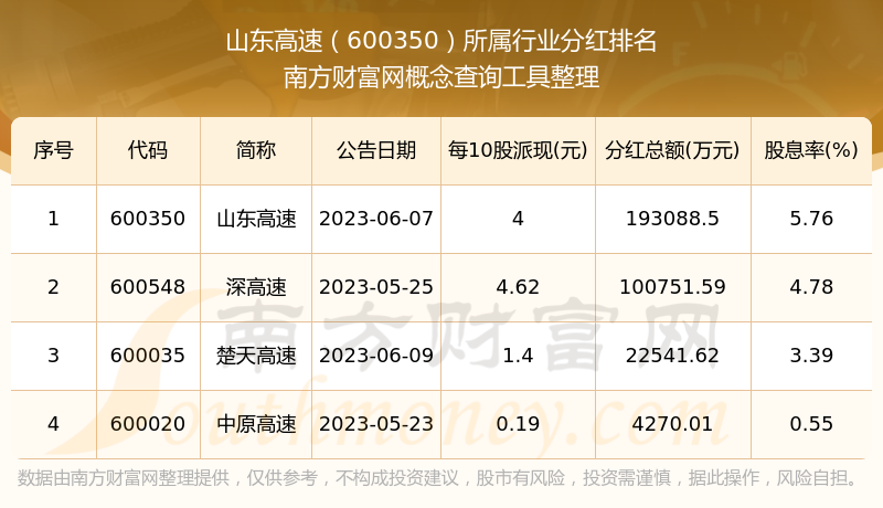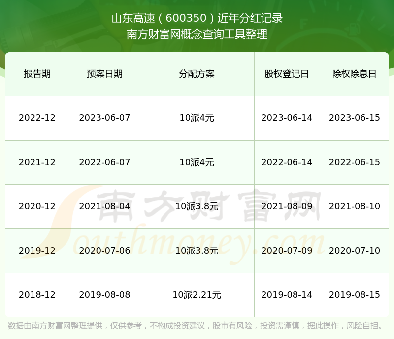 山東高速最新一次公布的分紅方案為10派4元。本次權(quán)益分派股權(quán)登記日為2023年6月14日,除權(quán)除息日為2023年6月15日,派息日為2023年6月15日。