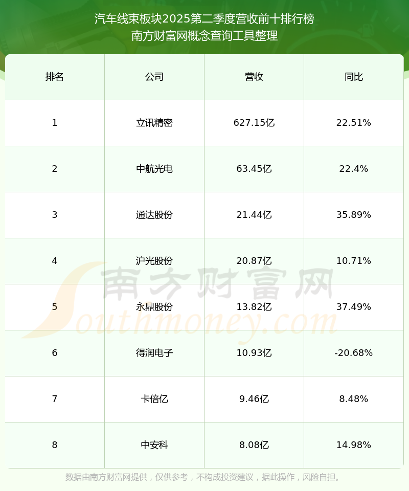按照南方財(cái)富網(wǎng)概念查詢工具統(tǒng)計(jì),該股所屬板塊為汽車線束板塊,該板塊共有8只股票,滬光股份2025第二季度營收在該板塊中排名為第4名,該板塊2025第二季度營收排名前十的股票如下表:
