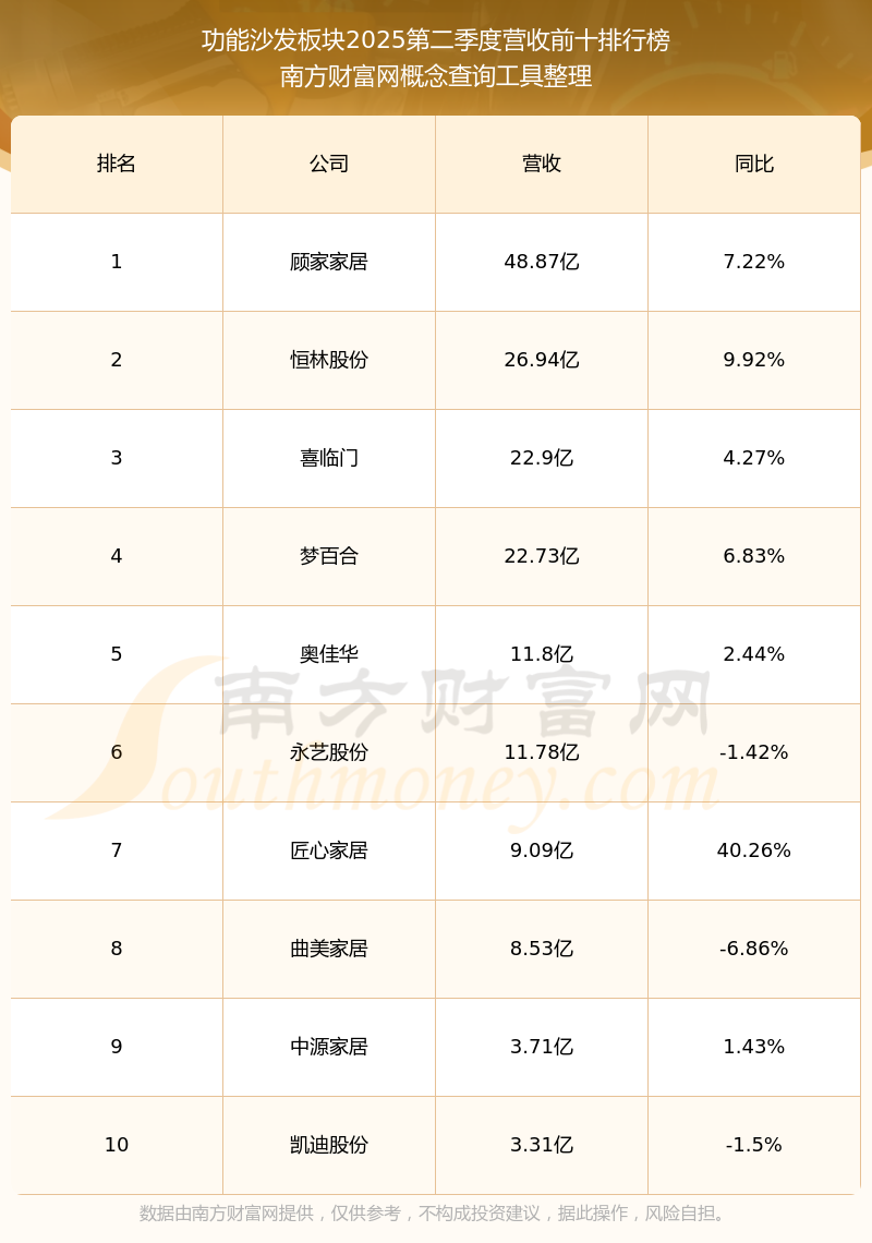 按照南方財富網(wǎng)概念查詢工具統(tǒng)計,該股所屬板塊為功能沙發(fā)板塊,該板塊共有11只股票,中源家居2025第二季度營收在該板塊中排名為第9名,該板塊2025第二季度營收排名前十的股票如下表: