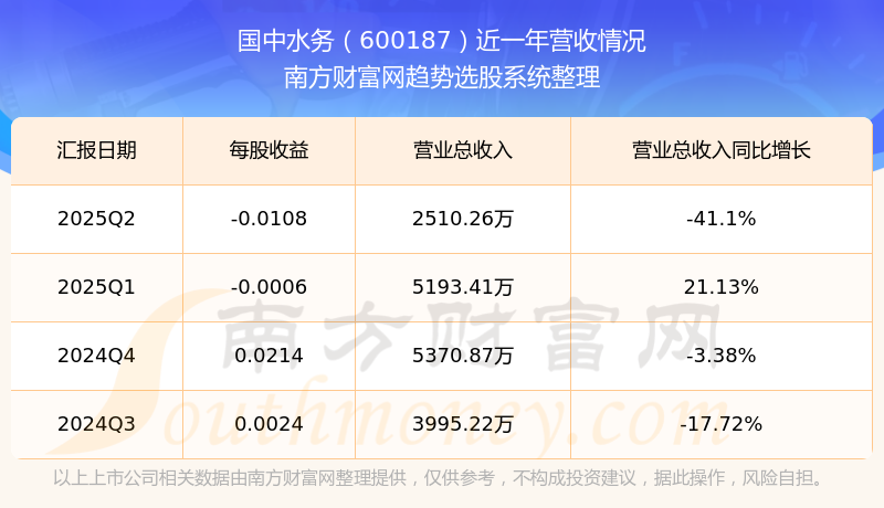 國中水務(wù)2025年第二季度財報顯示,公司主營收入2510.26萬元,同比-41.1%;歸母凈利潤-1729.46萬元,同比-638.32%;扣非凈利潤-1292.4萬元,同比-465.37%。