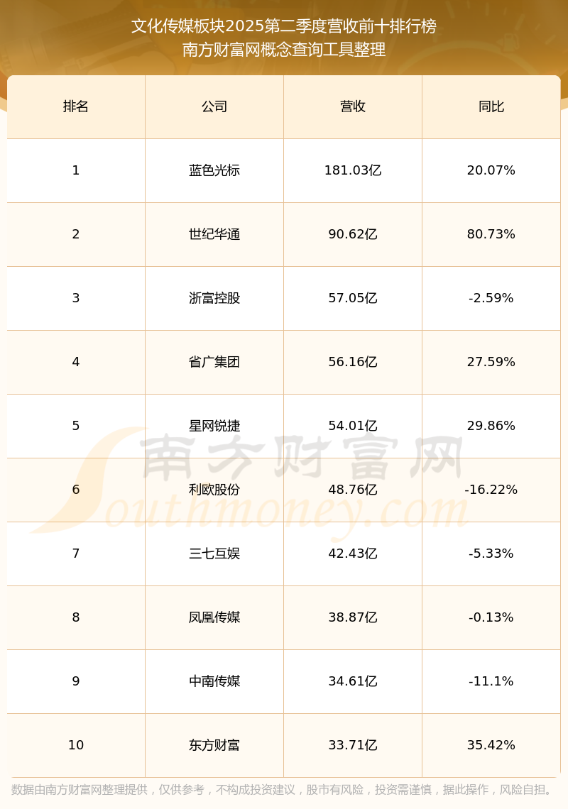 按照南方財富網(wǎng)概念查詢工具統(tǒng)計,該股所屬板塊為文化傳媒板塊,該板塊共有240只股票,鳳凰傳媒2025第二季度營收在該板塊中排名為第8名,該板塊2025第二季度營收排名前十的股票如下表: