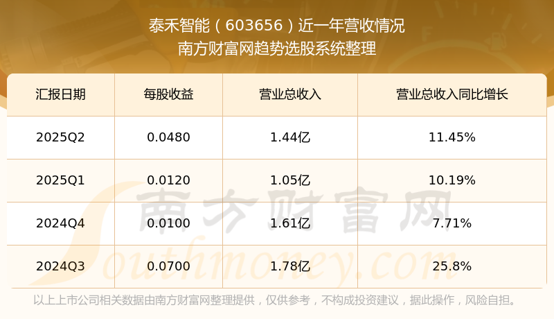 財報顯示,2025年第二季度泰禾智能營收1.44億元,同比增長11.45%,凈利潤848.73萬元,同比增長34.64%。