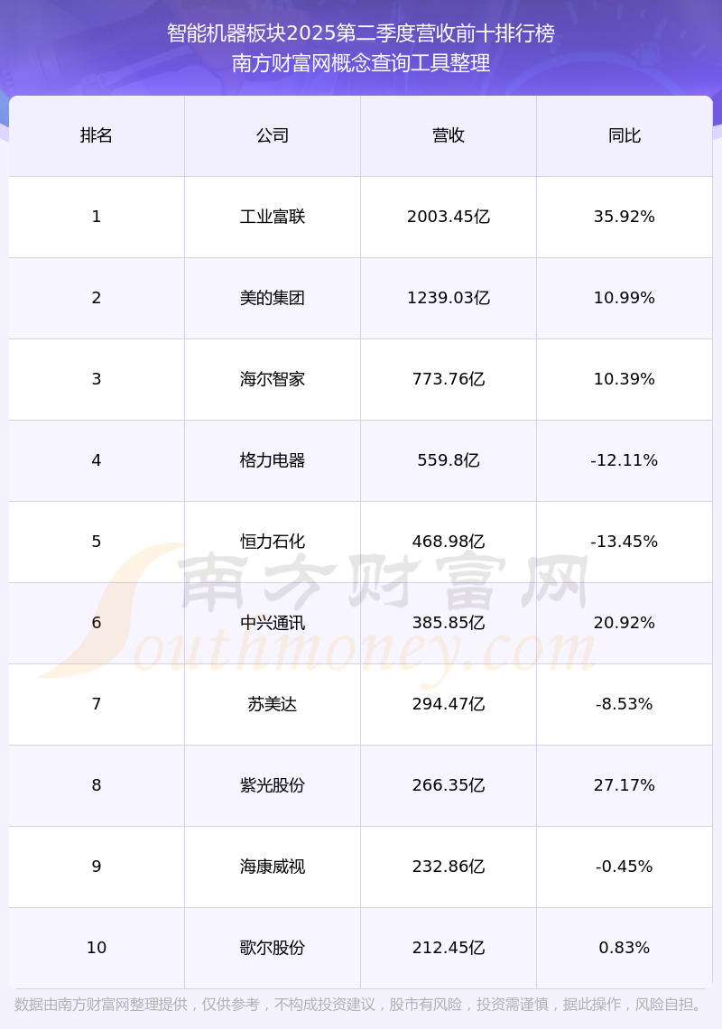 按照南方財富網(wǎng)概念查詢工具統(tǒng)計,該股所屬板塊為智能機器板塊,該板塊共有253只股票,泰禾智能2025第二季度營收在該板塊中排名為第217名,該板塊2025第二季度營收排名前十的股票如下表: