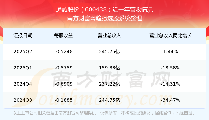 在2025年第二季度,通威股份的業(yè)績(jī)表現(xiàn),主營(yíng)業(yè)務(wù)收入達(dá)到245.75億元,實(shí)現(xiàn)了1.44%的同比增長(zhǎng)率。同時(shí),公司歸母凈利潤(rùn)錄得-23.63億元,同比增長(zhǎng)-0.85%。