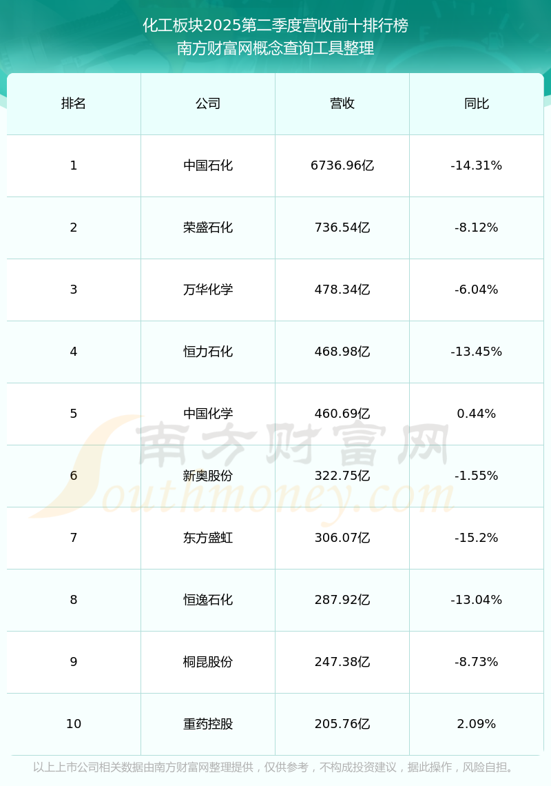 按照南方財(cái)富網(wǎng)概念查詢工具統(tǒng)計(jì),該股所屬板塊為化工板塊,該板塊共有569只股票,通威股份2025第二季度營(yíng)收在該板塊中排名為第569名,該板塊2025第二季度營(yíng)收排名前十的股票如下表: