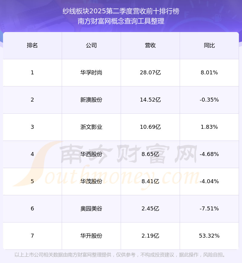 按照南方財富網(wǎng)概念查詢工具統(tǒng)計,該股所屬板塊為紗線板塊,該板塊共有7只股票,百隆東方2025第二季度營收在該板塊中排名為第7名,該板塊2025第二季度營收排名前十的股票如下表: