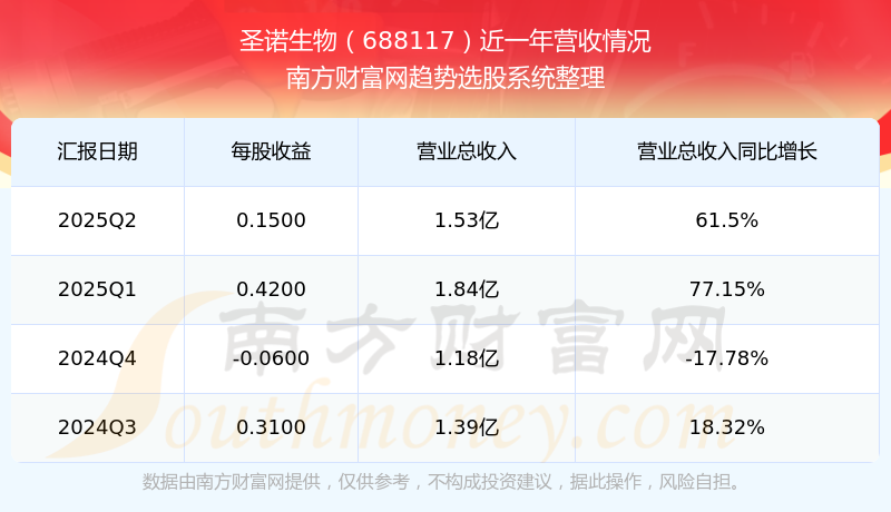 圣諾生物(688117)披露2025年第二季度報(bào)告,報(bào)告期實(shí)現(xiàn)營(yíng)收1.53億元,同比61.5%;歸母凈利潤(rùn)4183.7萬(wàn)元,同比687.09%;扣非凈利潤(rùn)4153.32萬(wàn)元,同比982.84%;基本每股收益0.15元。
