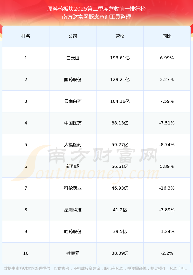 按照南方財(cái)富網(wǎng)概念查詢工具統(tǒng)計(jì),該股所屬板塊為原料藥板塊,該板塊共有121只股票,圣諾生物2025第二季度營(yíng)收在該板塊中排名為第101名,該板塊2025第二季度營(yíng)收排名前十的股票如下表: