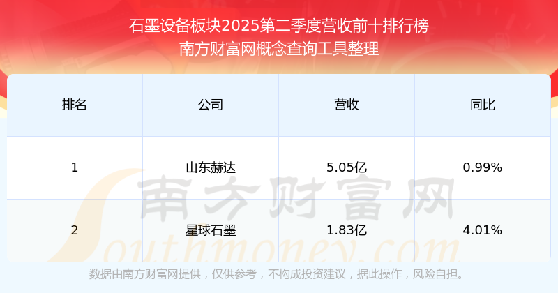 按照南方財富網(wǎng)概念查詢工具統(tǒng)計,該股所屬板塊為石墨設備板塊,該板塊共有2只股票,星球石墨2025第二季度營收在該板塊中排名為第2名,該板塊2025第二季度營收排名前十的股票如下表: