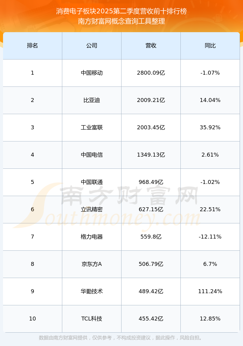 按照南方財富網(wǎng)概念查詢工具統(tǒng)計,該股所屬板塊為消費(fèi)電子板塊,該板塊共有437只股票,易德龍2025第二季度營收在該板塊中排名為第203名,該板塊2025第二季度營收排名前十的股票如下表: