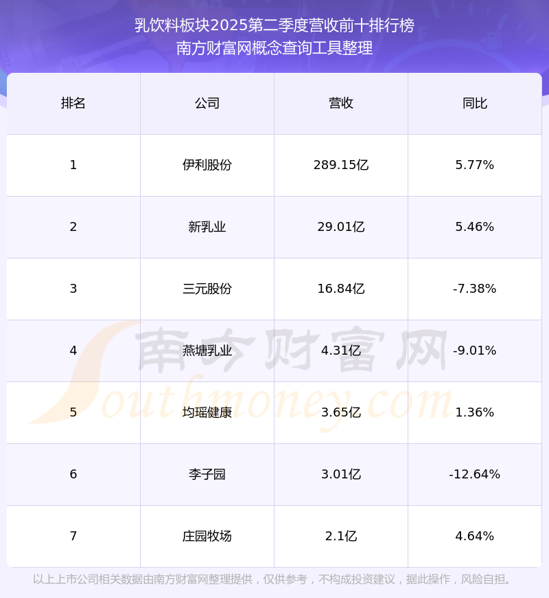 按照南方財(cái)富網(wǎng)概念查詢工具統(tǒng)計(jì),該股所屬板塊為乳飲料板塊,該板塊共有7只股票,李子園2025第二季度營(yíng)收在該板塊中排名為第6名,該板塊2025第二季度營(yíng)收排名前十的股票如下表:
