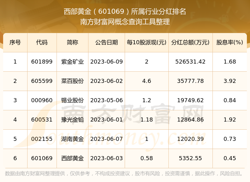 按照南方財(cái)富網(wǎng)趨勢(shì)選股系統(tǒng)統(tǒng)計(jì),西部黃金所屬行業(yè)為貴金屬行業(yè),貴金屬行業(yè)分紅排名情況如下表: