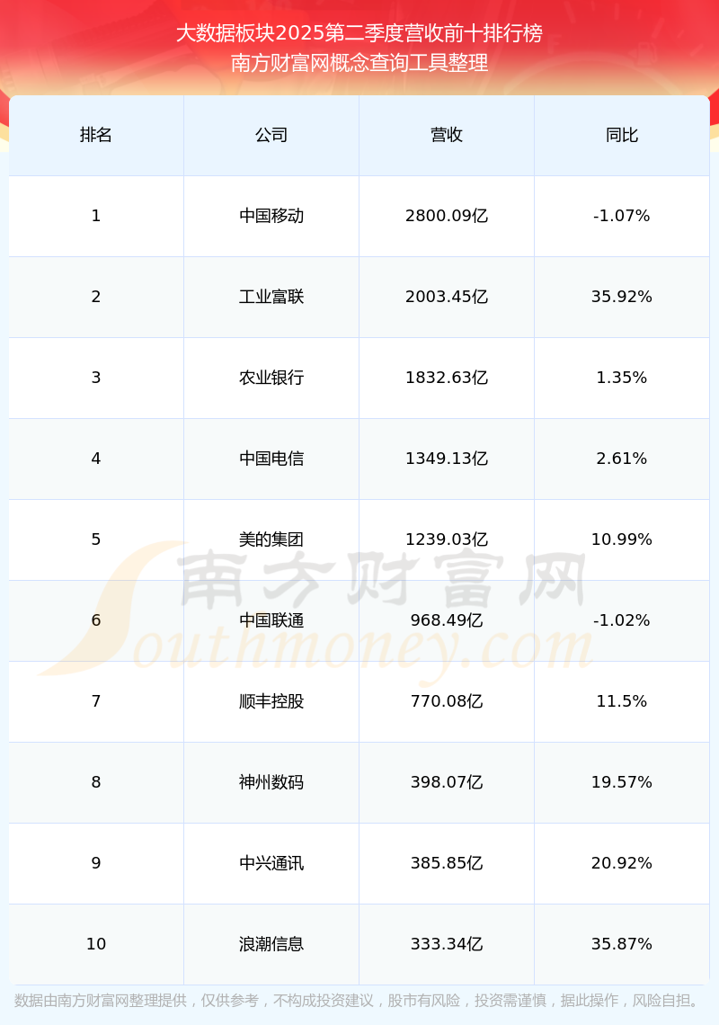 按照南方財(cái)富網(wǎng)概念查詢工具統(tǒng)計(jì),該股所屬板塊為大數(shù)據(jù)板塊,該板塊共有430只股票,華立股份2025第二季度營(yíng)收在該板塊中排名為第235名,該板塊2025第二季度營(yíng)收排名前十的股票如下表: