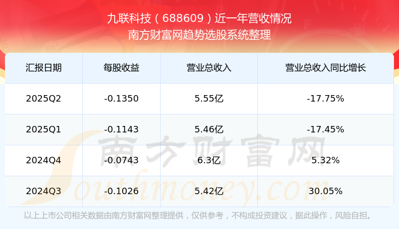 2025年第二季度,九聯(lián)科技營收同比-17.75%,凈利潤同比-13.06%。