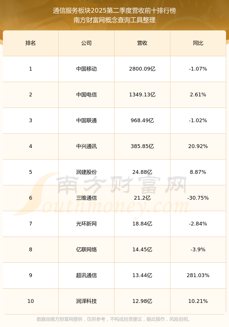 按照南方財富網(wǎng)概念查詢工具統(tǒng)計,該股所屬板塊為通信服務(wù)板塊,該板塊共有47只股票,九聯(lián)科技2025第二季度營收在該板塊中排名為第47名,該板塊2025第二季度營收排名前十的股票如下表: