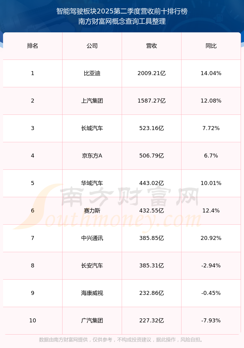 按照南方財富網(wǎng)概念查詢工具統(tǒng)計,該股所屬板塊為智能駕駛板塊,該板塊共有401只股票,鴻泉物聯(lián)2025第二季度營收在該板塊中排名為第327名,該板塊2025第二季度營收排名前十的股票如下表: