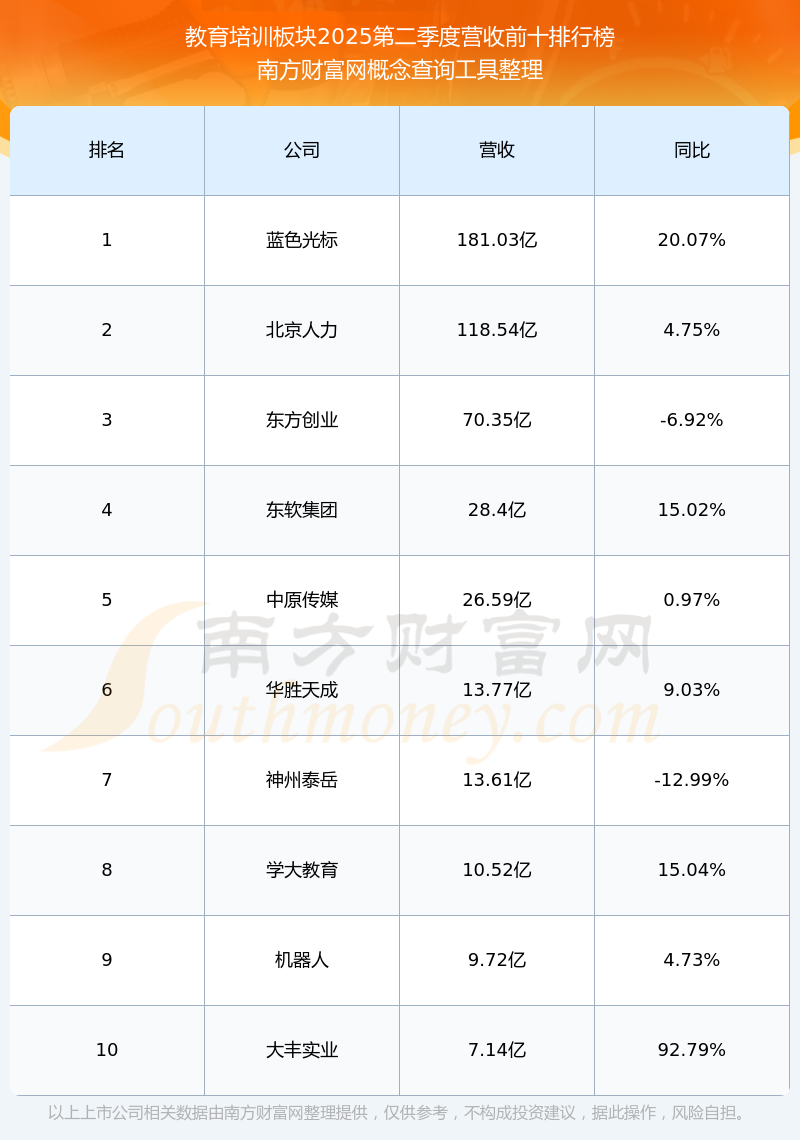 按照南方財(cái)富網(wǎng)概念查詢工具統(tǒng)計(jì),該股所屬板塊為教育培訓(xùn)板塊,該板塊共有58只股票,昂立教育2025第二季度營收在該板塊中排名為第20名,該板塊2025第二季度營收排名前十的股票如下表: