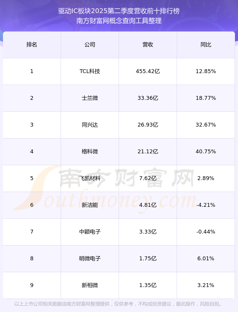按照南方財富網概念查詢工具統(tǒng)計,該股所屬板塊為驅動IC板塊,該板塊共有9只股票,必易微2025第二季度營收在該板塊中排名為第9名,該板塊2025第二季度營收排名前十的股票如下表: