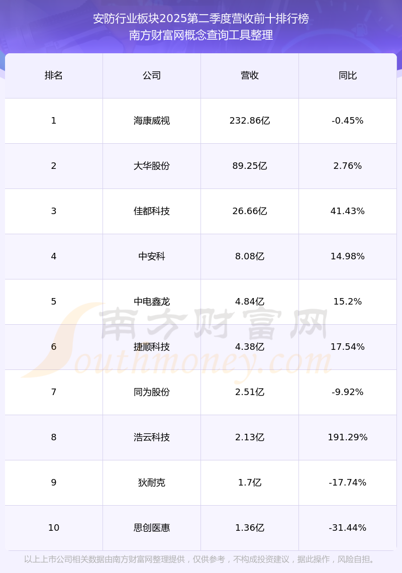 按照南方財(cái)富網(wǎng)概念查詢工具統(tǒng)計(jì),該股所屬板塊為安防行業(yè)板塊,該板塊共有16只股票,中安科2025第二季度營收在該板塊中排名為第4名,該板塊2025第二季度營收排名前十的股票如下表: