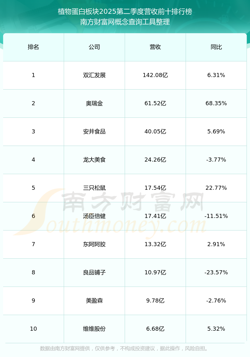 按照南方財富網(wǎng)概念查詢工具統(tǒng)計,該股所屬板塊為植物蛋白板塊,該板塊共有17只股票,索寶蛋白2025第二季度營收在該板塊中排名為第17名,該板塊2025第二季度營收排名前十的股票如下表: