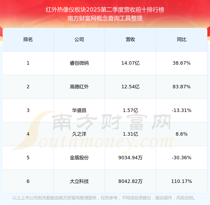按照南方財富網(wǎng)概念查詢工具統(tǒng)計,該股所屬板塊為紅外熱像儀板塊,該板塊共有6只股票,睿創(chuàng)微納2025第二季度營收在該板塊中排名為第1名,該板塊2025第二季度營收排名前十的股票如下表: