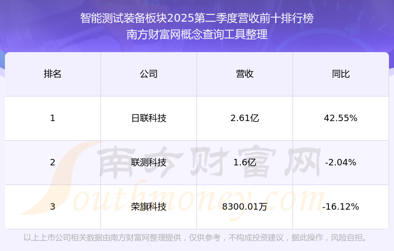 按照南方財(cái)富網(wǎng)概念查詢工具統(tǒng)計(jì),該股所屬板塊為智能測試裝備板塊,該板塊共有3只股票,聯(lián)測科技2025第二季度營收在該板塊中排名為第2名,該板塊2025第二季度營收排名前十的股票如下表: