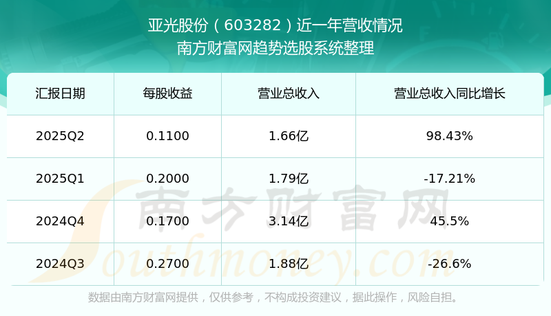 亞光股份發(fā)布2025年第二季度財報。實現總營收1.66億元,同比增長98.43%;扣非凈利潤同比增長1572.03%至1381.22萬元。